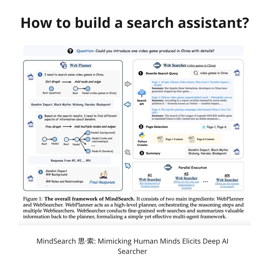 Finding information on the Internet might be a hard task, but LLM-based agents solve this problem. The recent success of Perplexity and OpenAI's plan to build a search product shows how important this is. The MindSearch paper describes how to build your own search assistant.