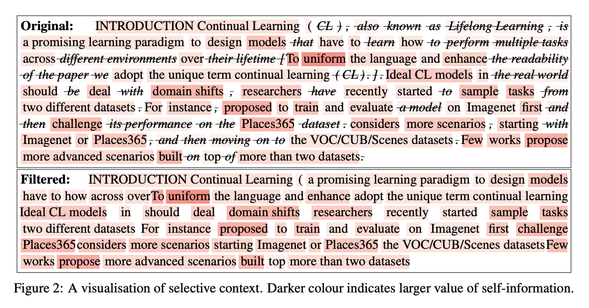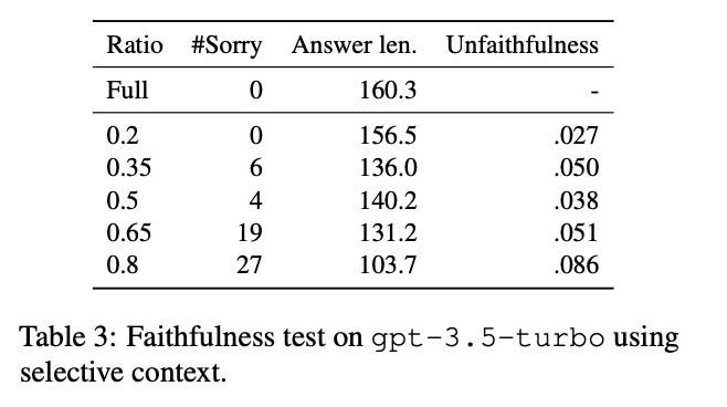 The Selective Context method achieves a 32% reduction in inference time, 36% in inference memory and 50% in context cost without sacrificing performance too much. The basic idea behind this method is that written language carries more information than is needed for understanding. Example: "Do you like tea? Yes, I do like tea". Some people say that just saying yes is sufficient for this question. Now, the task is to find words that do not add much meaning and remove them.